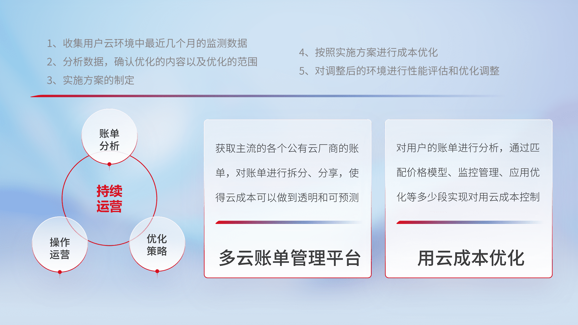通过灵活运用多种自动化迁移工具,,,帮助企业用户实现业务和数据高效 、、、稳定的上云迁移和云上迁移,,,采用自研多云纳管平台,,,,以中立管理模式,,,,解决多组织、、、多云、、、多运维厂商的复杂关系的管理,,,保证多云平台资源配置的一致性,,,实时掌控云资源运行数据,,,运用智能化工具分析云资源多云平台的管理服务,,透明化管理成本支出,,,,用云成本可预测、、、、用云费用可优化、、、云资源配额有据可依。。