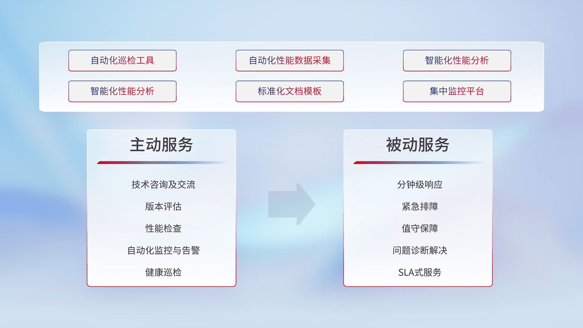 智能化工具和标准化文档,,保障服务质量,,提供主动服务(包含技术咨询、、、版本评估、、、性能检查、、自动化监控与告警、、、、健康巡检)和被动服务包含(分钟级响应、、、紧急排障、、值守保障、、问题诊断解决、、、、SLA服务)。。。。